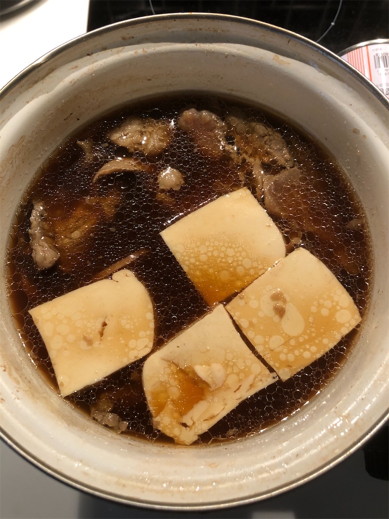 牛すじ肉とお好みの大きさに切った豆腐、薄切りにした生姜を鍋に入れ、肉を煮込んだ茹で汁と醤油、酒、砂糖を入れ弱火で20分ほど煮込む。もちろん煮込み時間は長い方が味が馴染んで美味しいと思います。また、茹で汁は牛すじ肉から出たコラーゲンが溶け込んでおり、写真の様にコクがたっぷりのスープになっています。今回のレシピではこのコラーゲンのコクを前面に出すため、前回使用した鰹出汁は使用しません。